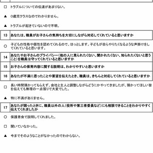 「施設環境は清潔か」「職員の子どもへの対応」「保育内容の説明」等では9割台と高い評価をいただきました。